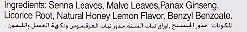 senna leaves, malve leaves, panax ginseng, licorice root, natural honey lemon flavor, benzyl benzoate.