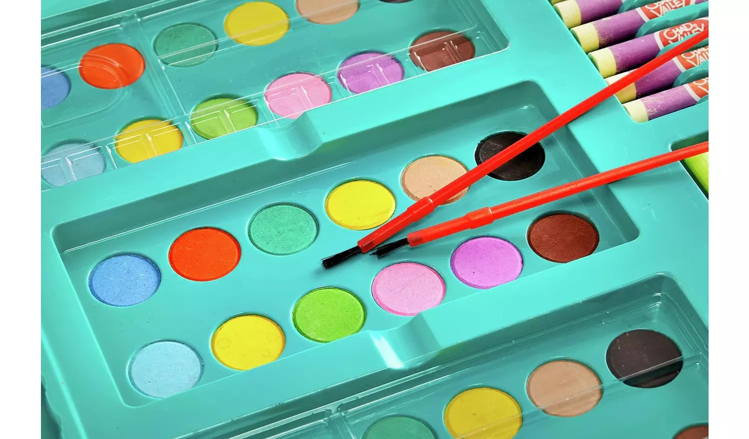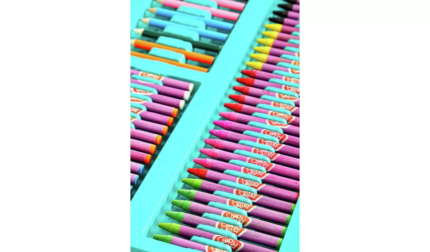 - Includes oil pastels, watercolour paints, fine line markers, mini markers, chalks, pencils, paper, sharpener and paintbrushes.