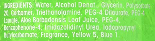 Water, Alcohol Denat., Glycerin, Polysorbate 20, Carbomer, Triethanolamine, PEG-4 Dilaurate, PEG-4 Dilaurate, Aloe Barbadensis Leaf Juice, PEG-4, Benzophenone-4, Imidazolidinyl Urea, Iodopropynyl Butylcarbamate, Fragrance, Yellow 5, Blue 1