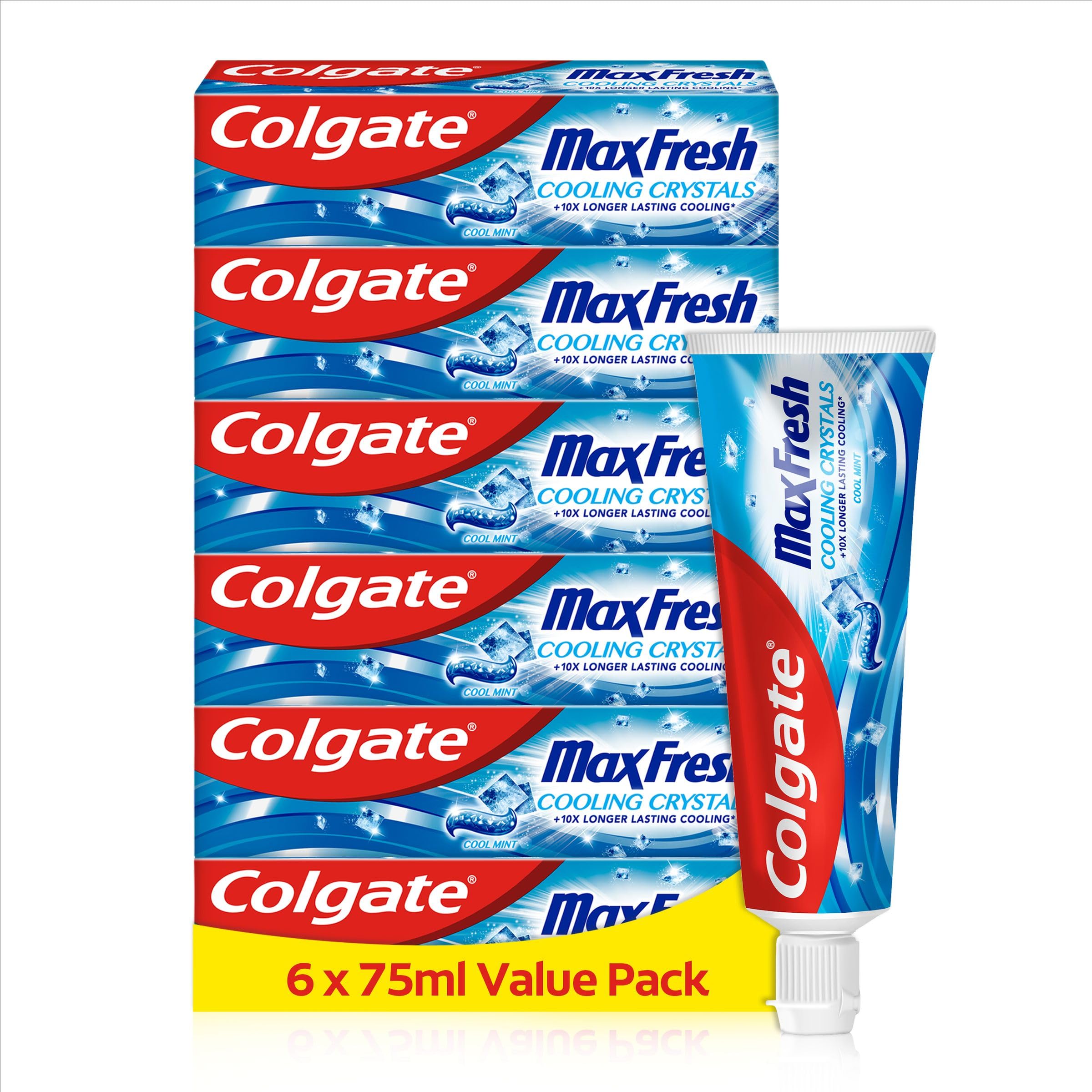 - WHAT YOU’LL GET: Includes six (6) 75ml tubes of Colgate Max Fresh Cooling Crystals Cool Mint toothpaste