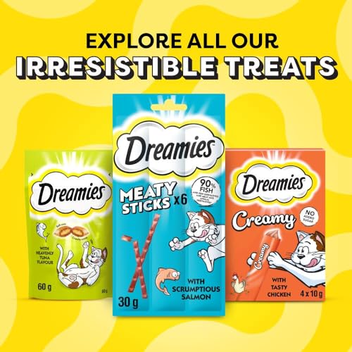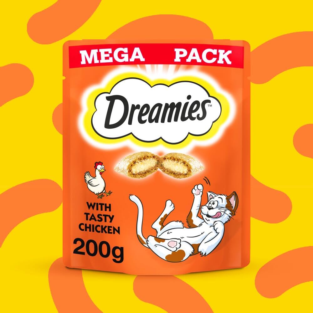 - Items Delivered: 1 x 200 g mega packs of Dreamies cat snacks in Chicken flavour. These pockets of cat snacks come in 5 delicious varieties including Chicken, Salmon, Cheese, Turkey and Tuna flavour