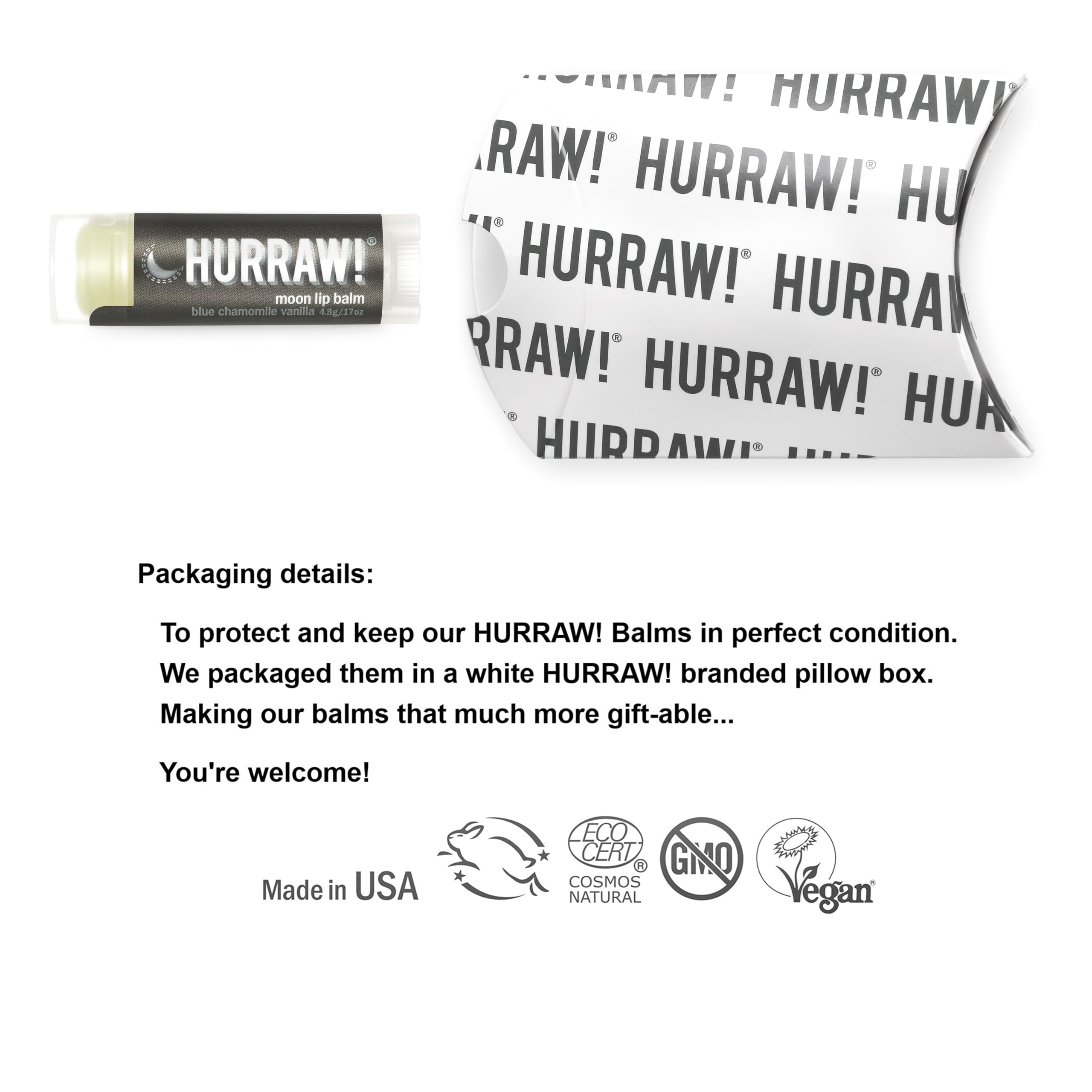 - ONE 4.8g/.17oz Oval Tube of Moon (Night Treatment) Lip Balm packaged in a white HURRAW! branded pillow box. Extra thick, creamy and rich; this balm has some serious staying power. The vanilla and peru balsam scent will lull you to sleep. Azulene packed blue chamomile soothes your lips for some true beauty z’s! Made with certified organic, vegan, and raw ingredients. Hurraw! Lip Balms are certified 100% all natural origin, cruelty and gluten free. Non-GMO. Bee, Shea, Soy and Palm Free.