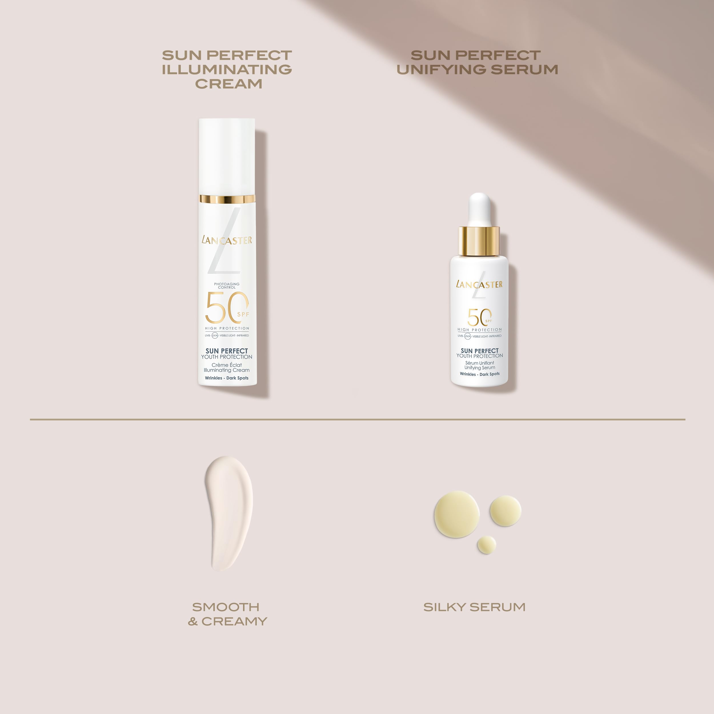 - Reversing the visible signs of aging caused by photoaging, Lancaster’s new Sun Perfect Unifying Serum SPF50 is a potent concentrate featuring ultra-broad sun protection with anti-aging and repair efficacy. This daily photoaging shield promotes unified, perfected and younger-looking skin.
