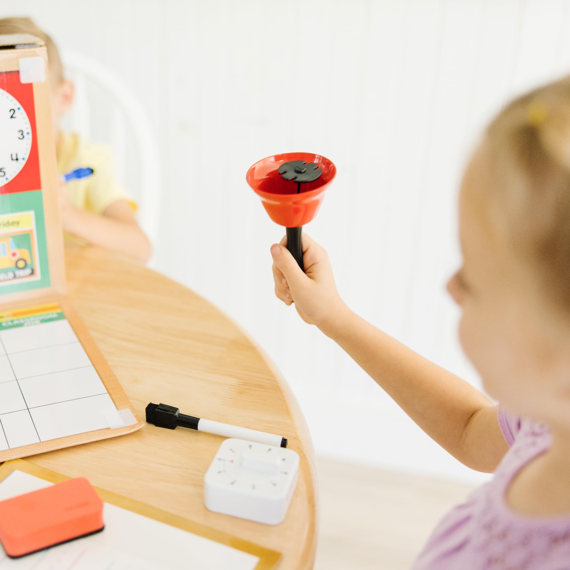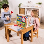 - Play set features drop-down teacher desk and student desk to create classroom environment
