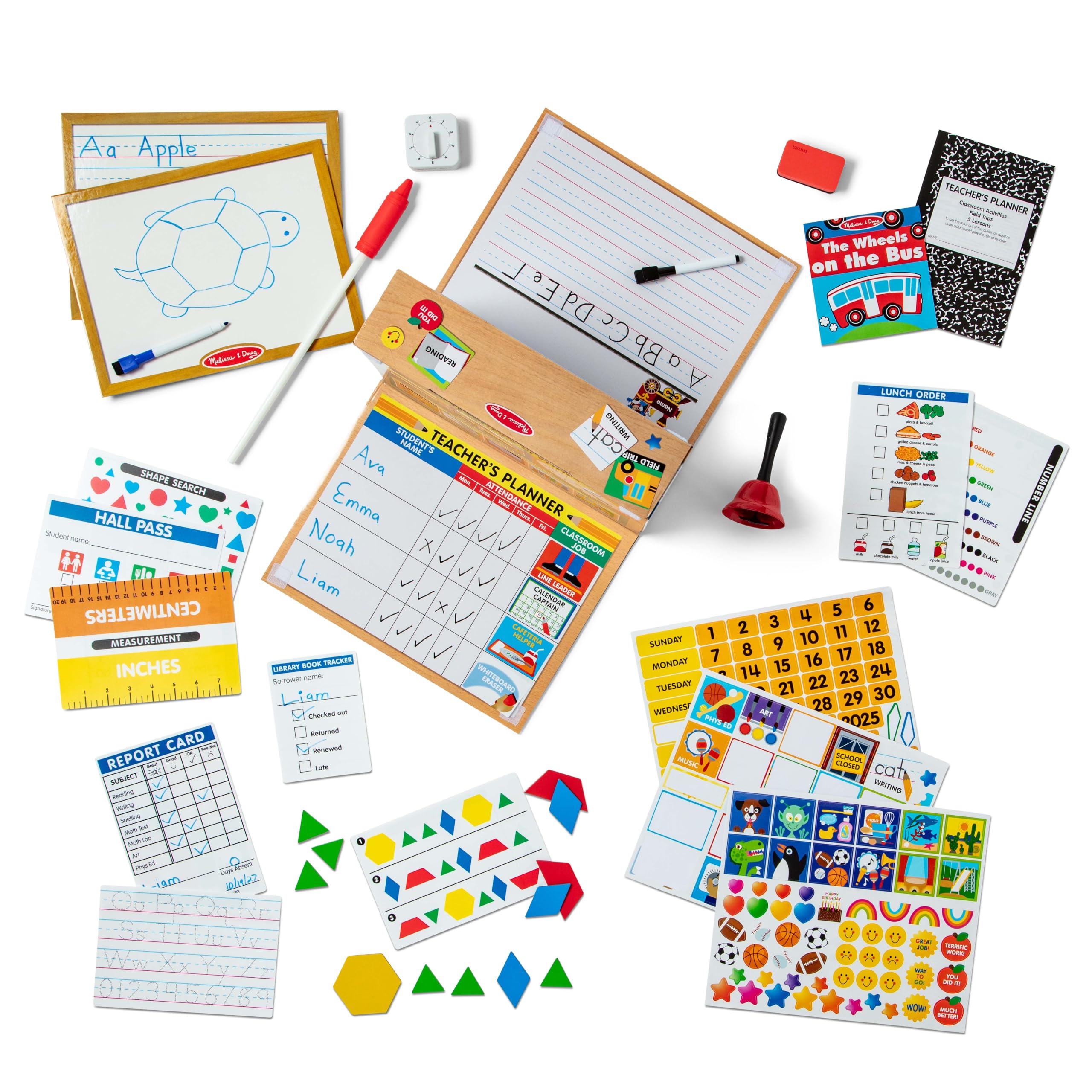 - Includes 150 reusable stickers, 12 pattern blocks, bell, timer, lesson plan guide, storybook, and more