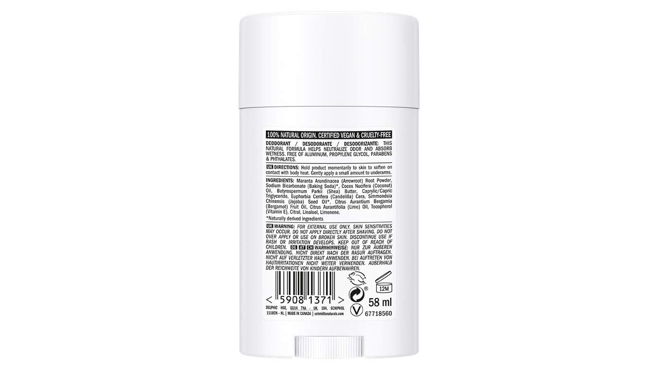 Our award-winning formulas from Schmidt’s use innovative, plant-based and mineral ingredients. We believe that it is possible to make small and effective changes in our lives that will do us well in the long term. We are committed to setting a new standard for natural products. We believe that the future of body care is in high quality, plant-based formulas – without sacrificing any ingredients, performance or application. It is our mission to revolutionize the way natural products are viewed. We have heard natural deodorants do not work. That is why we have set ourselves the goal of developing naturally effective deodorants. Our natural and vegan formulations without aluminium, propylene glycol, parabens, phthalates and artificial fragrances help neutralise odours and keep you naturally fresh. The non-greasy or sticky texture is easily absorbed – a small amount is enough. Hold the product on your skin for a moment to soften it by contact with your body heat. Apply a small amount gently to your armpits. Our original formula uses sodium hydrogen carbonate to neutralise odours and is a little stronger than conventional deodorants – this compacted formula provides special odour protection and requires only a small amount to achieve a positive effect. With its invigorating citrus fragrance, Bergamot + Lime is a true freshness experience.