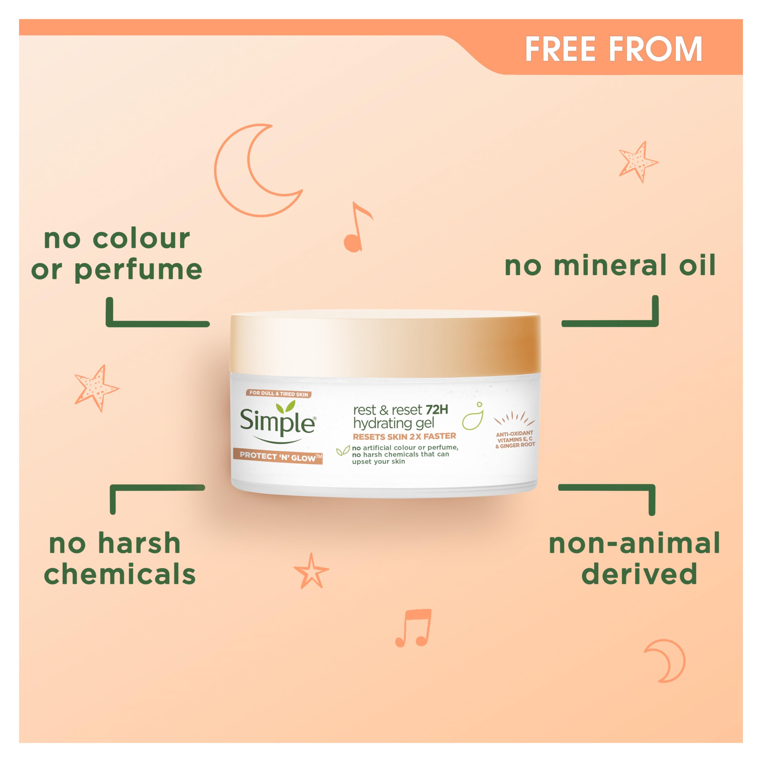 Waking up to radiant skin is finally a real thing, thanks to our Protect ‘N’ Glow Rest and Reset 72h Hydrating Gel. Yasss! Supercharged with ingredients that help brighten dull complexions, this overnight gel is your shortcut to get the glow you’ve always dreamed of. Plus, it’s even suitable for sensitive skin. But our night cream goes even further. Did you know, overexposure to UV rays, pollution and blue light from your fave electronic devices can leave your skin looking dull and feeling sensitive? Well, if you’re struggling to quit your bedtime phone-scrolling routine, our Simple Hydrating Gel protects against these skin-damaging elements, to give your skin a perfect night’s sleep. Suitable to use every night, this Simple moisturiser contains antioxidant Vitamins C & E and organic Ginger Root for revitalised, bright skin. Plus, it boosts your skin’s hydration and renewal process, for glowing skin by morning. Dreamy! With no animal derived ingredients, Protect ‘N’ Glow Rest and Reset 72h Hydrating Gel is certified cruelty-free and vegan by PETA. Like all Simple products, this face cream is free from artificial colour and perfume and has no harsh chemicals that can upset your skin. In fact, we only include mild ingredients that love your skin.