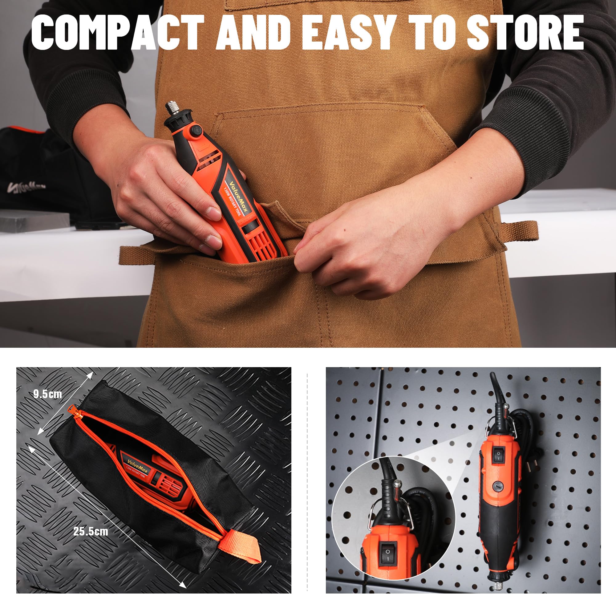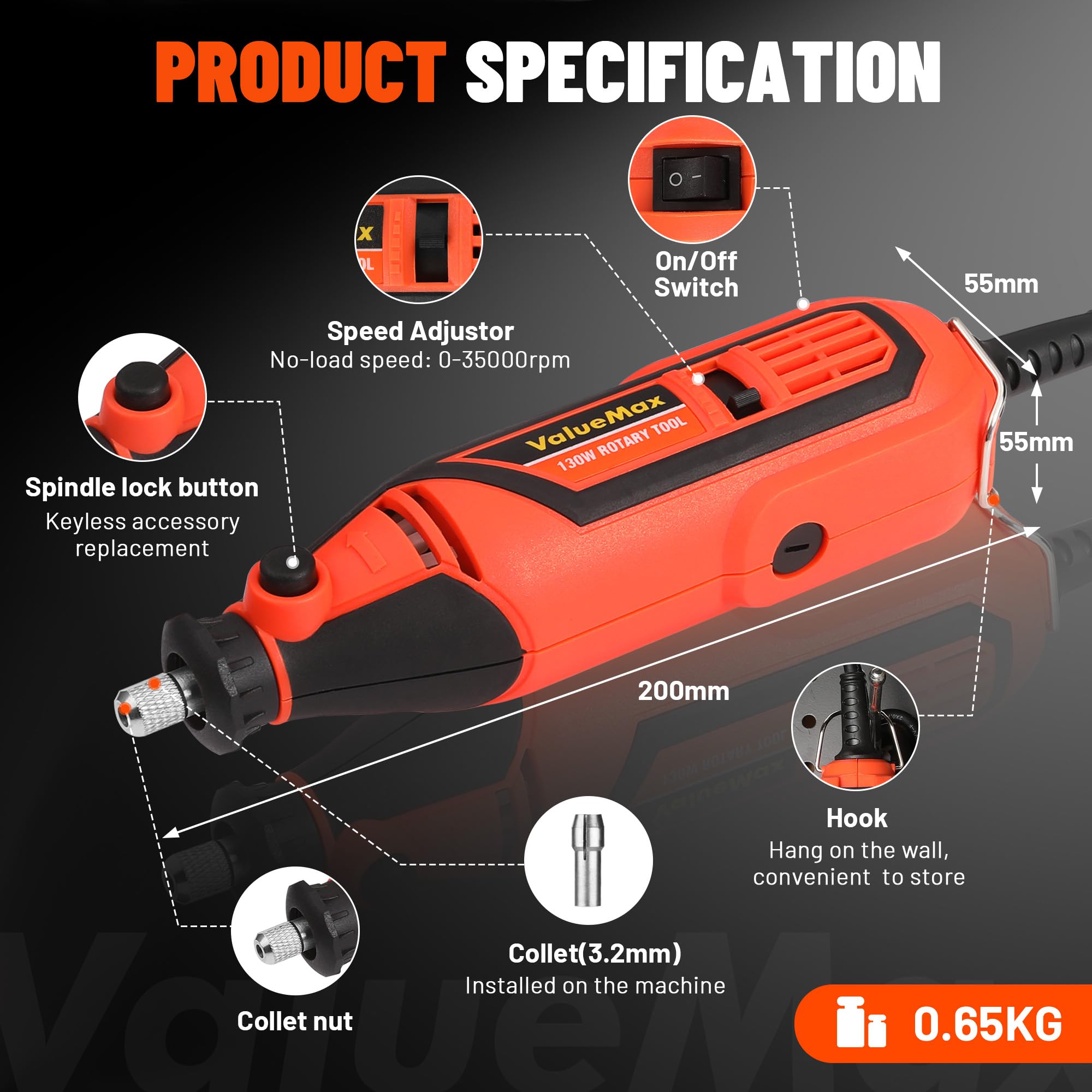 - 【Multi-functional Rotary Tool Kit】ValueMax rotary tool kit equipped with a powerful 130W pure copper motor. Offers you strong and stable performance for various uses. It Comes with 119pcs rotary tool accessories, so you can complete different work projects efficiently. Great for sanding, polishing, cutting, drilling, cleaning, engraving, and more.